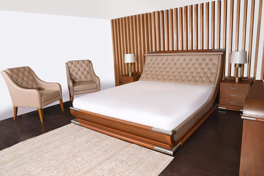 | Outer Structure made of acacia wood and walnut vinboard combination and inner structure made of fir wood and walnut ply. Bed every corner embellished with ss pipe. Headboard having a upholstery panel embellished with quilting work and side rails made of particular board over past best quality rubber foam and covered with leatherette. bed and side table finish with walnut stain with NC base lacquer polish with 5 to 8 under sealer coat and 2 to 4 top lacquer coat. Each side table have 3 and dresser have 8 drawers with best quality pulls and handles. Side table each side having a upholstery panel. | ||